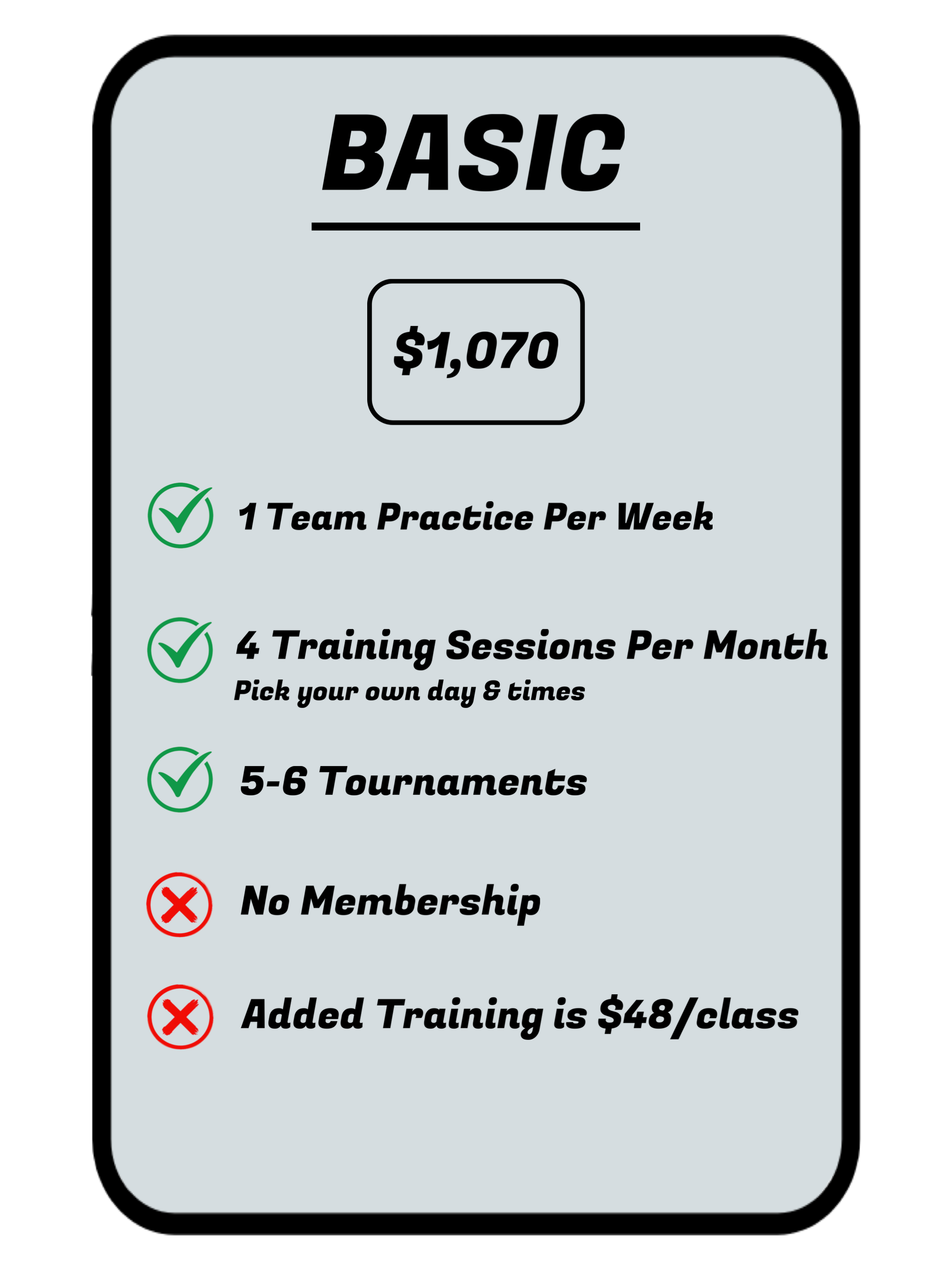 Our NO MEMBERSHIP package, which includes 1 practice a week, 1 training session a week, and 5-6 tourneys.
