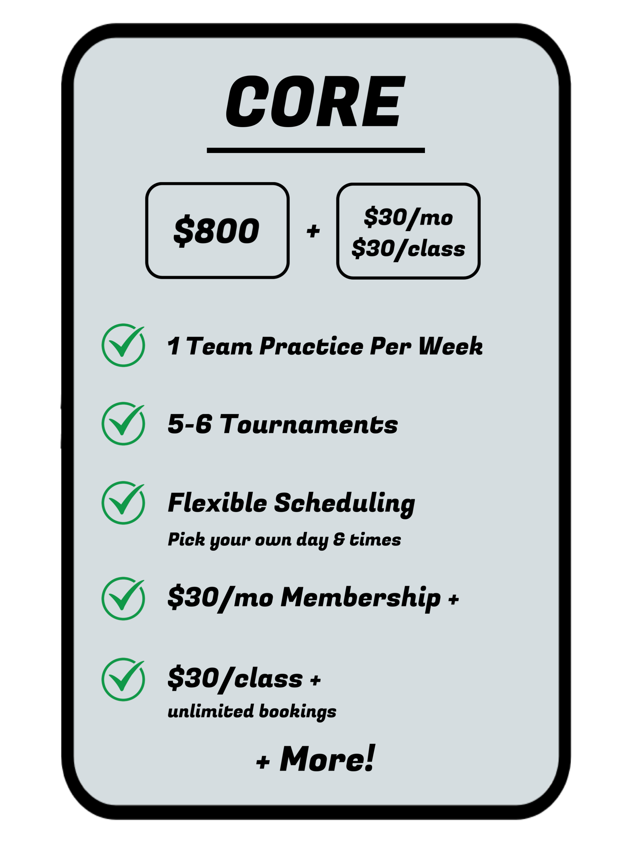 Membership plans include 1 practice a week, and 5-6 tourneys… add CORE or PRO to meet your desired training frequency + scheduling needs!