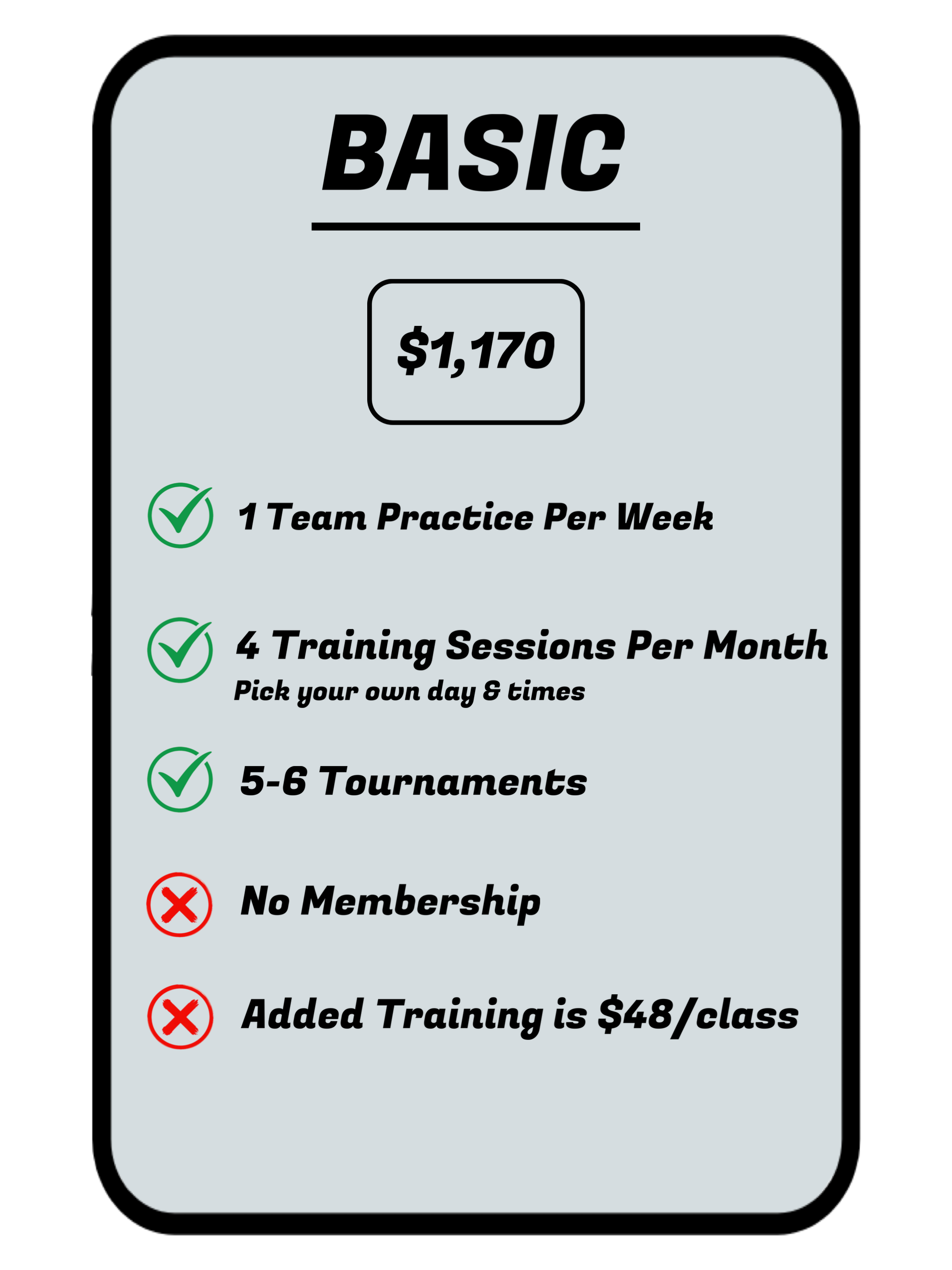 Our NO MEMBERSHIP package, which includes 1 practice a week, 1 training session a week, and 5-6 tourneys.