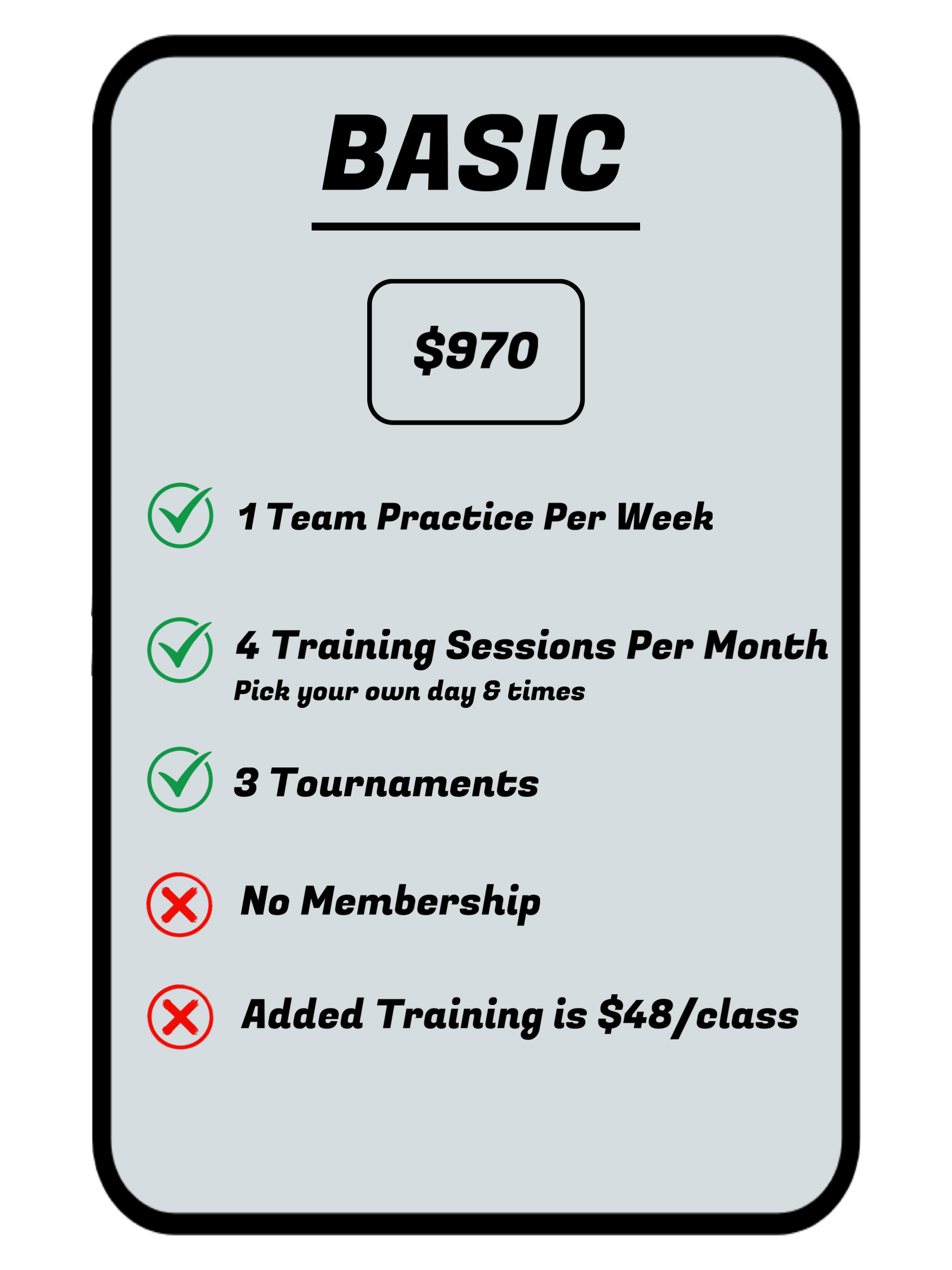 Our NO MEMBERSHIP package, which includes 1 practice a week, 1 training session a week, and 5-6 tourneys.