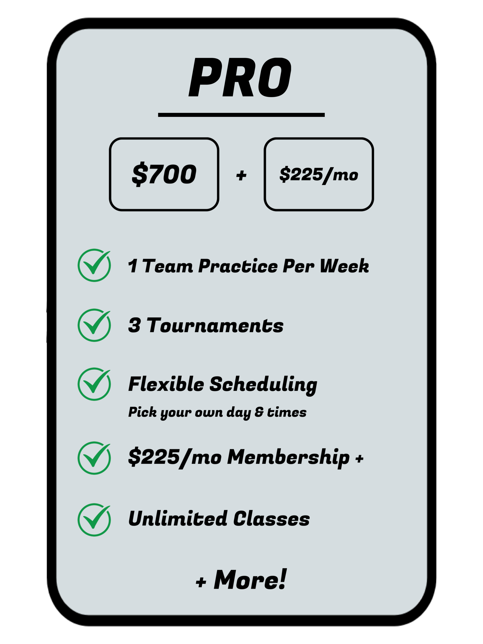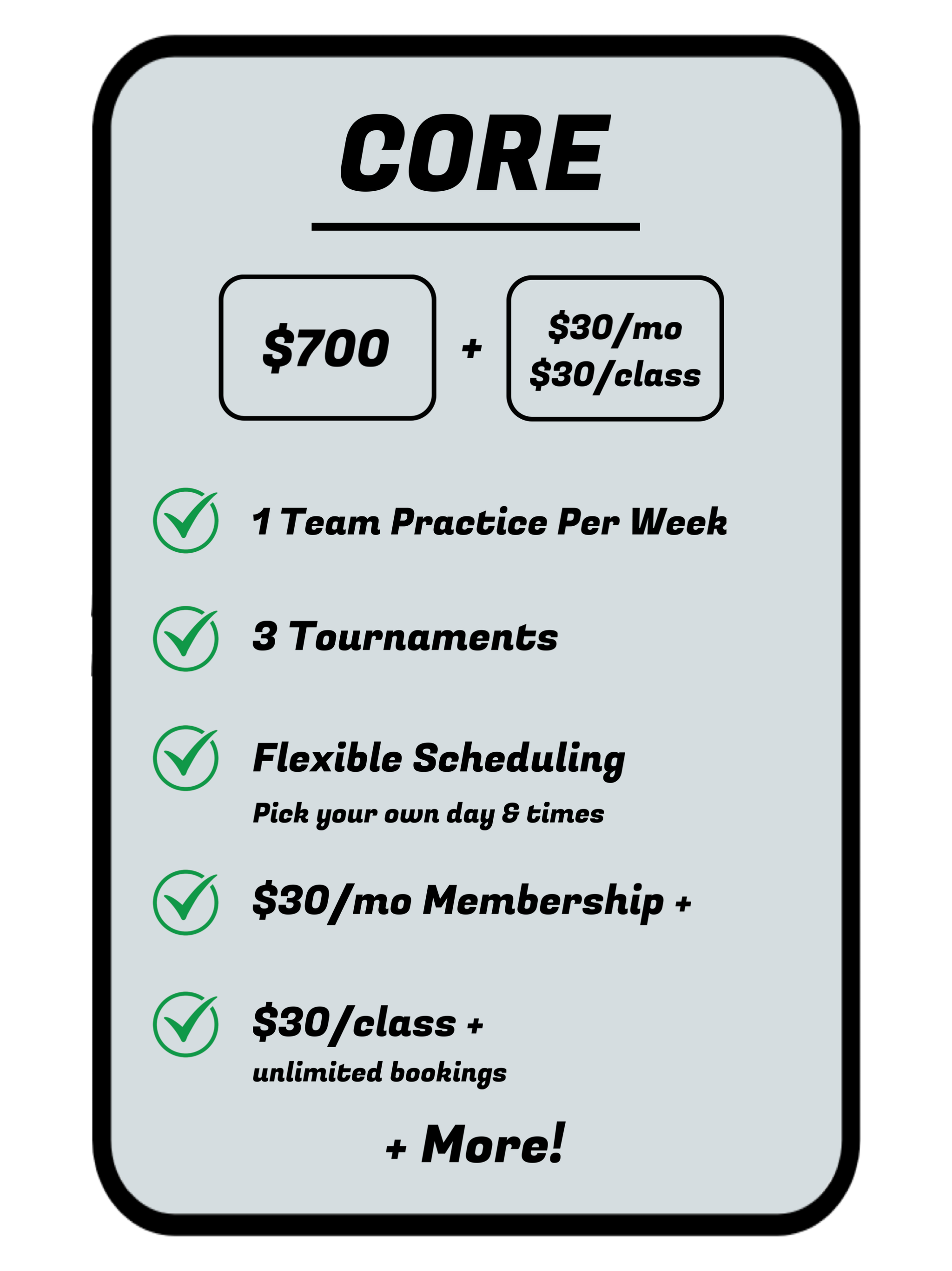 Membership plans include 1 practice a week, and 5-6 tourneys… add CORE or PRO to meet your desired training frequency + scheduling needs!