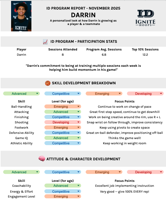 ID athletes receive individualized progress reports monthly & quarterly, giving players and parents real-time feedback directly from Ignite’s coaching staff.